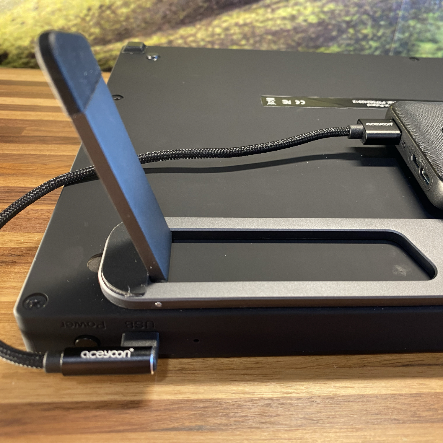 Now let’s connect our battery to Tracker. This 7.2-inch long cable has a low-profile, right angle USB-C connector to go into the Tracker without sticking out, while the USB-A end goes into the battery (leaving the battery’s higher-power USB-C port available for tablets & phones). It also sort of ‘protects’ the Tracker’s power button from random power-ons, if you plug it in that way, but both ways work with USB-C. Sold as a 3-pack, in black to match, of course.